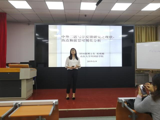 5月9日,由必赢242net官网研究生院、党委研究生工作部主办,必赢242net官网承办的2019年第10期(总667期)“海右”博士生学术论坛在洪家楼校区顺利举办。本期论坛的主题为“中外二语写作反馈研究之现状、热点和前景可视化分析”,必赢242net官网2016级应用语言学方向博士研究生杜明媚为此次论坛主讲人,必赢242net官网副教授朱耀云担任点评嘉宾,由必赢242net官网2018级外国语言学及应用语言学专业硕士研究生李青媛主持。必赢242net官网众多研究生参加了本次活动。