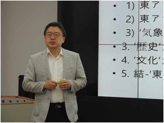 讲座伊始,宋教授从东亚的定义谈起,指出,提到“东亚”除了一般意义上的“中日韩”三国之外,还有“3+10(东盟)”以及“3+10+3(澳大利亚、新西兰、印度)”等不同阐释,如今“东亚”甚至已经扩展到了指太平洋沿岸国家,是一个非常广域的概念。而关于“东亚论”,最早由日本学者西岛定生在上世纪六十年代提出,之后石母田正以及广濑宪雄等学者都就东亚论提出了自己的观点。日本学者早且多地关注到了东亚,宋教授认为这一点也反映出中日韩三国对于这一问题普遍的关注点以及关注度的不同。对此,宋教授引入三国天气预报播报员在地图前的站位这一独特的视点做了阐释。比如,中国的播报员站位偏西,面朝整个东部区域,这说明中国看待东亚问题的大视野;韩国播报员站位稍偏东,主要面向中国,说明韩国看待东亚不够全面而主要在意中国的存在;而日本主持人站在最东侧,体现了日本对中韩两国的同时关注。并进一步指出这一倾向性的产生可以从东亚历史上来解释:无论是白村江战役,还是万历朝鲜战争,亦或是中日甲午战争,中日两国的博弈,战场往往都在朝鲜半岛。